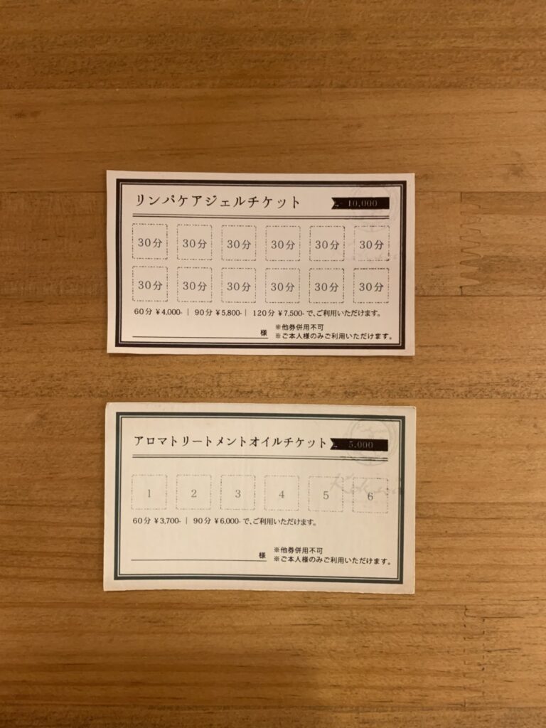 ジェルチケットとオイルチケットについて kokowaで、取扱いしてるジェルチケットとオイルチケットについて説明します。 ジェルチケットは、360分で1枚のチケットになっています。先… トピックス 2019.12.16