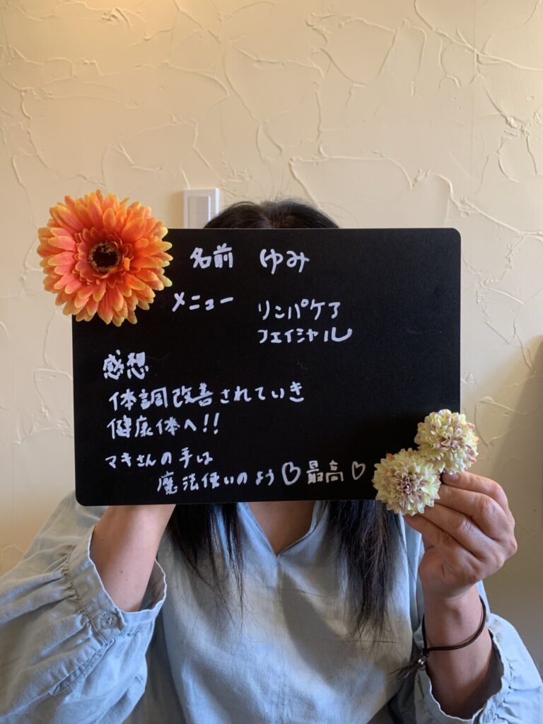 最近とっても久しぶりに、一言感想をお願いしました。今回書いてくださったお客様は、今年に入ってからほぼ毎週ご来店してくださってるゆみ様です。ご来店回数を数えたら今回で、13回目でした。メニューはいつも、リンパケアやリフトアップフェイシャルを受けてくださいます。